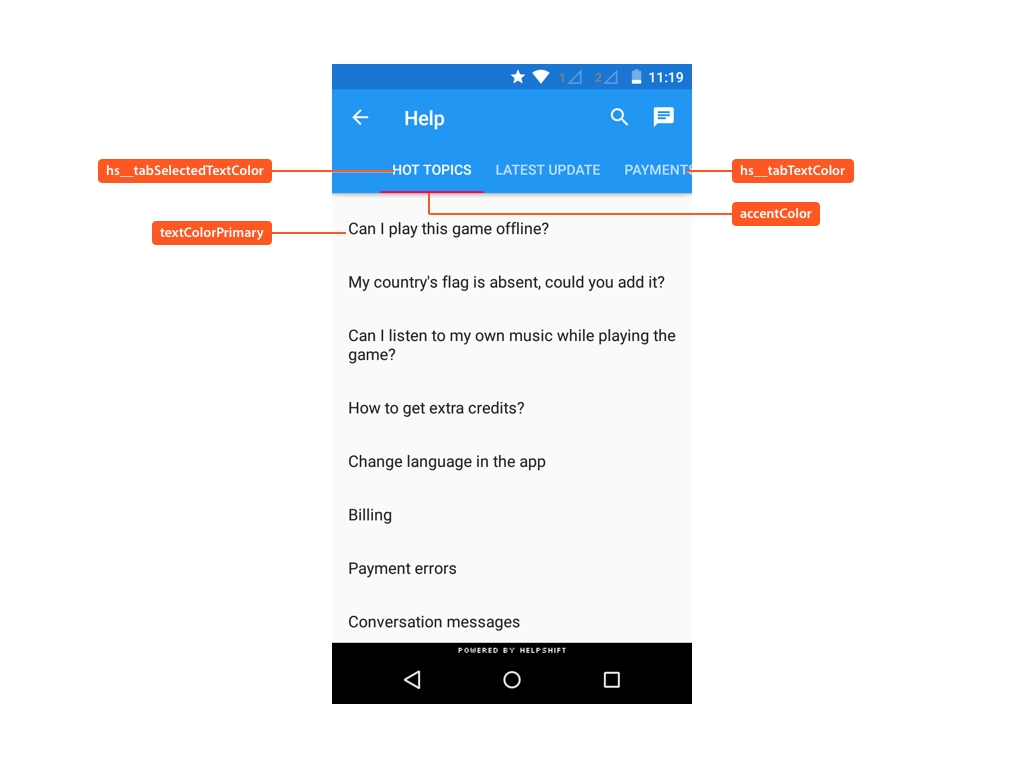 The following illustrates use of these styleable attributes over Helpshift SDK's UI: