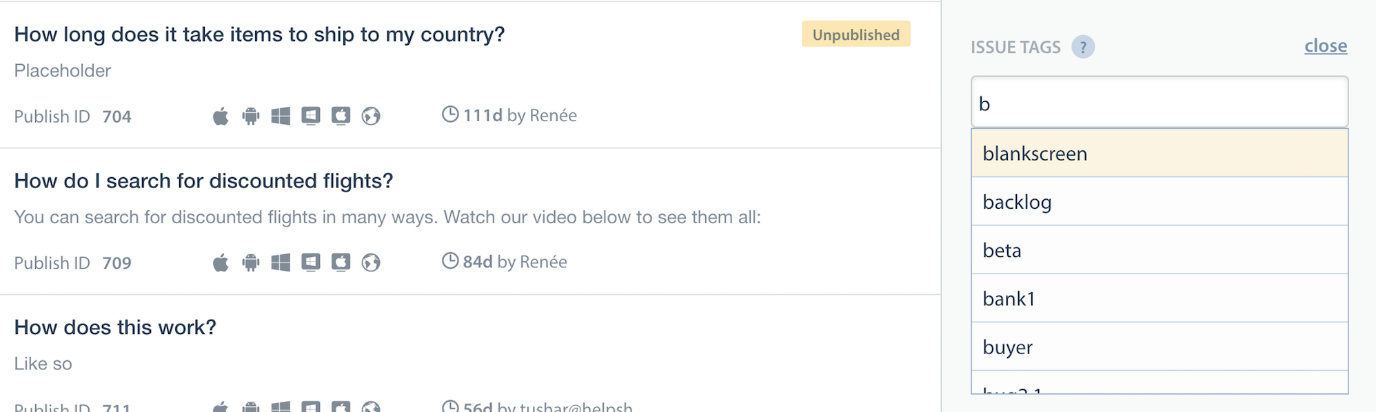- Search tags (a.k.a Search Keywords) When performing in-app search, Helpshift SDK gives preference to these keywords. You can also use this to add alternative keywords that users might search for, but which may not exist in the FAQ title or the content.